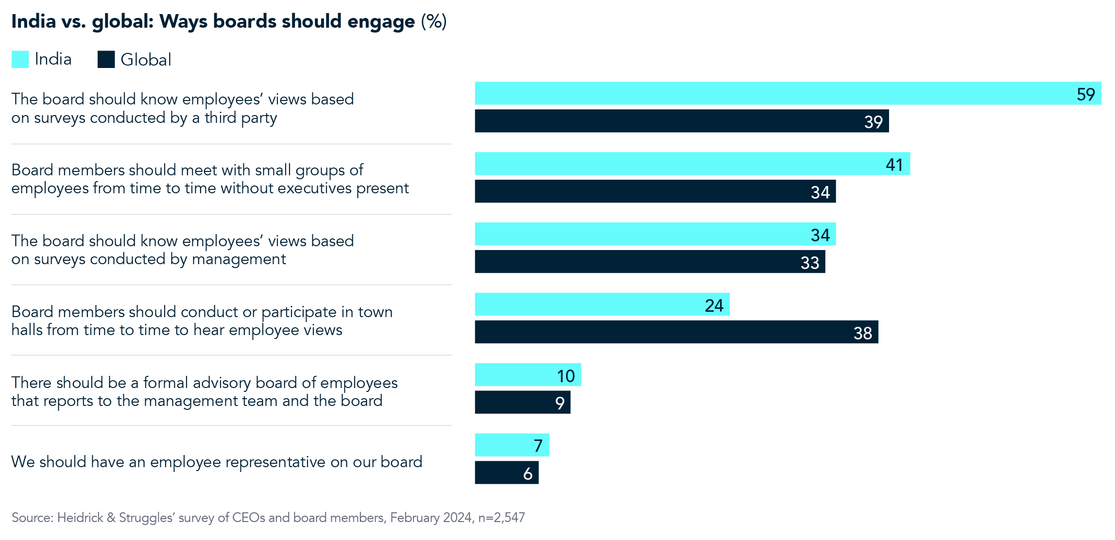 Workers are increasingly influencing the board agenda globally. A number of trends are driving this, including demographic changes, income inequality concerns, talent shortages, inflation, the resurgence of labor unions, and the proliferation of social media organizing platforms. To better understand the impact of this on how the board does its work, we asked respondents how they think they should engage with employees other than the most senior executives. A significant majority (86%) believe directors should engage with employees deeper in the company; only 13% believe they should not (the rest said they didn’t know). The figures are similar for India.