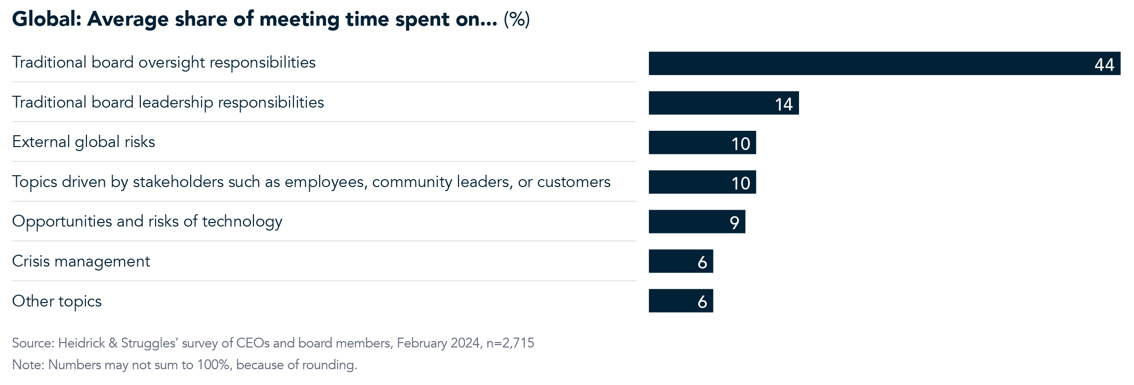 There is broad agreement globally, among both managing directors and directors, that the board meeting agenda remains primarily focused on “traditional board oversight responsibilities” (financial performance and risk, stockholder concerns, and strategy reviews, for example) and “traditional board leadership responsibilities” (managing director succession planning and leadership performance and compensation, for example). Together, these categories take up nearly 60% of boards’ time. External global risks, the opportunities and risks associated with technology (AI and cyber) and other stakeholder issues capture about 10% each in the balance of the meeting schedule. Crisis management and other topics round out the balance.