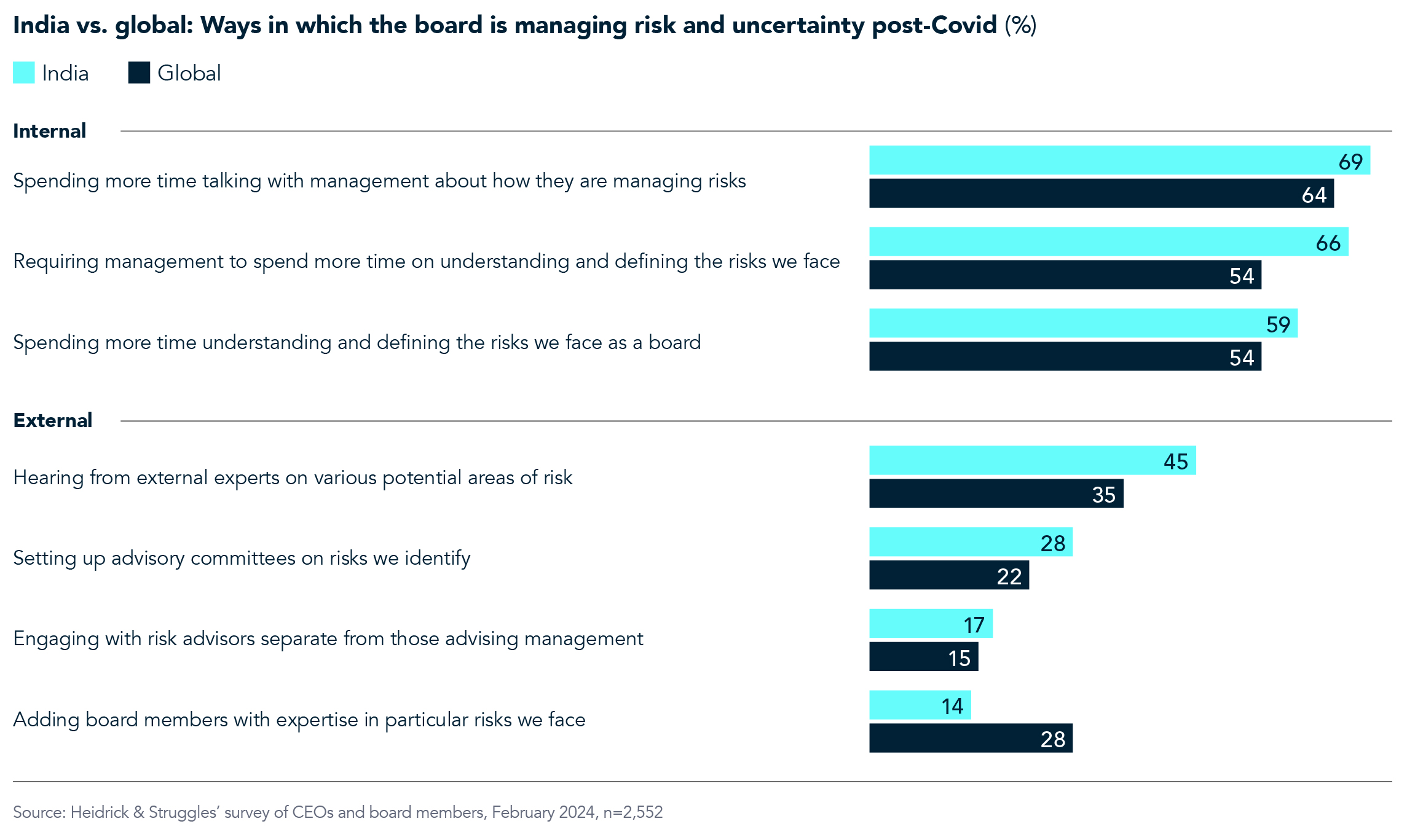 To better understand how boards are adjusting to this new reality, we asked what steps they have taken since Covid began to better manage uncertainty and risk. Respondents remain anchored primarily in risk management practices that are “internal” in nature; that is, derived from interactions among the board itself and between the board and management. However, we also see a growing willingness to draw in the contributions of “external” experts.