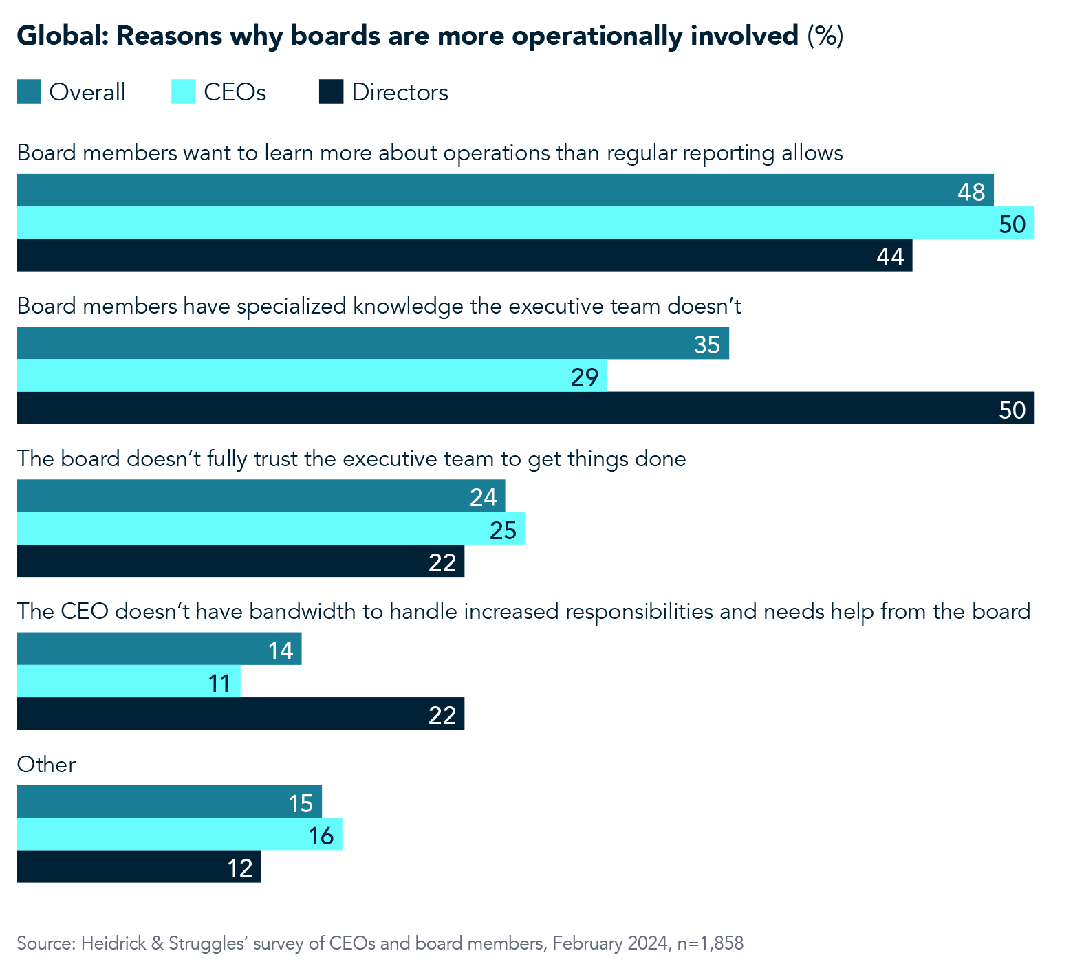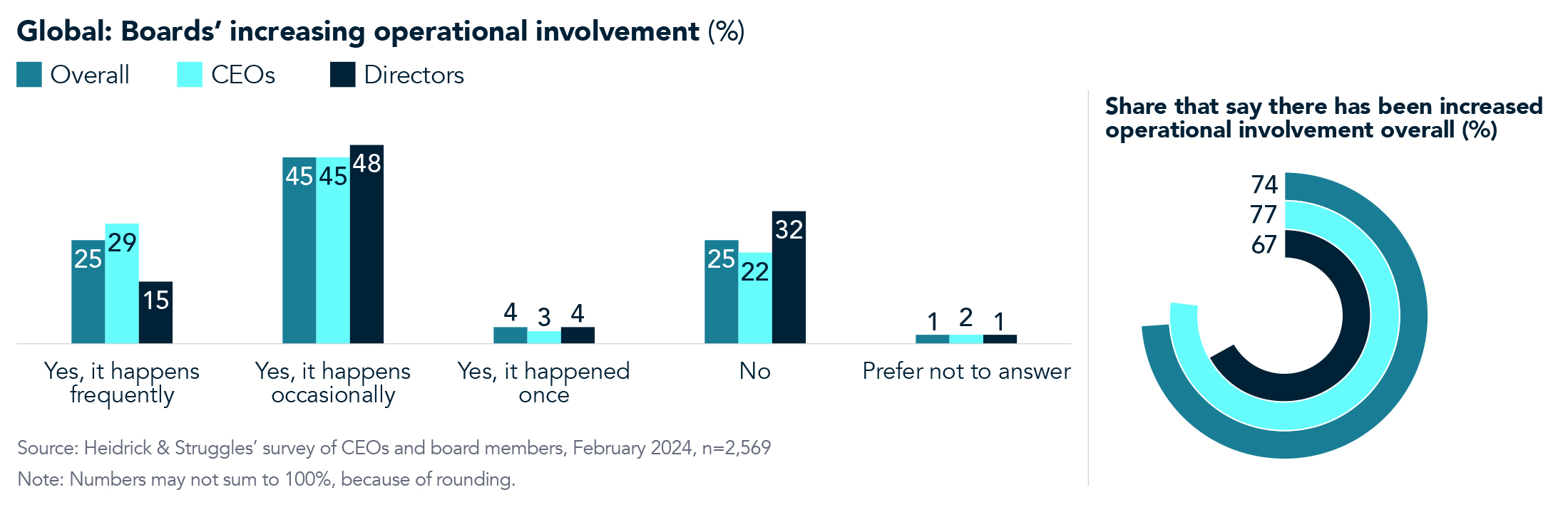 Globally, a majority of respondents report that board members are more operationally involved: 25% say it happens frequently; 45% occasionally; and 4% that it has happened once. Only a quarter report that they have not crossed that line. Notably, CEOs more often than directors report operational involvement from the board.