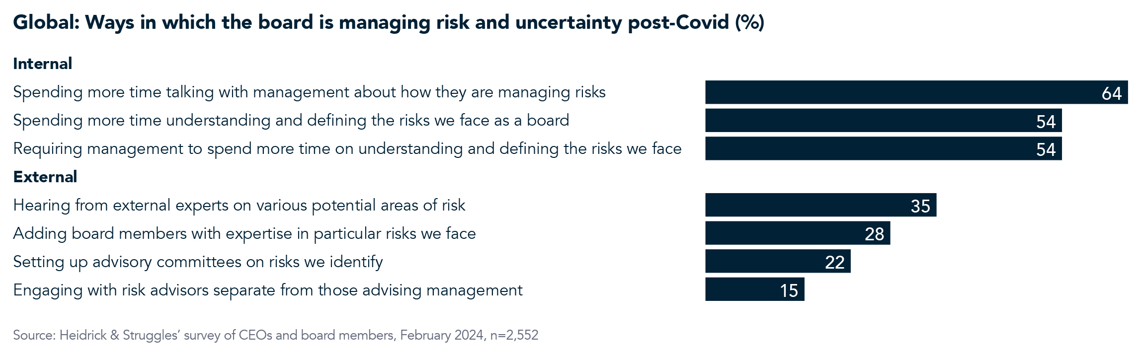 Governing in a complex environment with an increasing accelerated rate of change requires new and practical approaches to ensuring expertise and managing risk. When we asked what steps boards have taken since Covid began to better manage uncertainty and risk, their responses leaned toward an internal focus on risk management, primarily through interactions among the board itself or between the board and management. However, we also see a growing willingness to draw in the contributions of external experts.