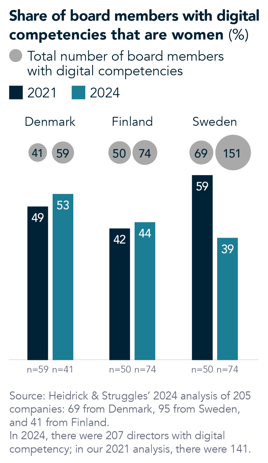 Overall, the results indicate incremental progress. Sweden saw the biggest increase in company progression, with 59% of organizations in our study having at least one board member with digital capabilities, up from 49% previously. Finland retains the highest share of boards with digital skill sets, showing an uptick to 68% from 63%. This may be a reflection of the Finnish population’s high levels of digital literacy and the government’s ambitious national digital policies, potentially making it easier to find board members with good technology skills.3 Denmark closely lags behind Sweden at 54%, up from 47%.