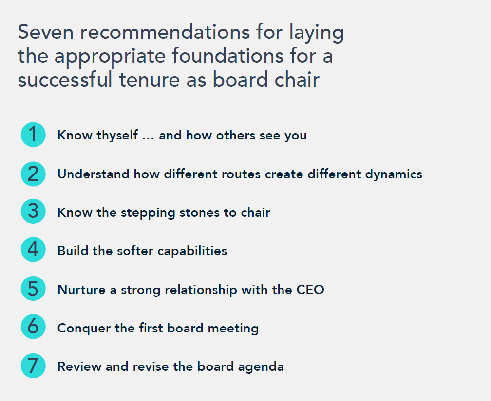 Based on numerous discussions with public company chairs and our own research1 on the route to the chair role for first-timers, we offer recommendations for laying the appropriate foundations for a successful tenure in the chair’s seat and for newly appointed chairs to ensure they land well.