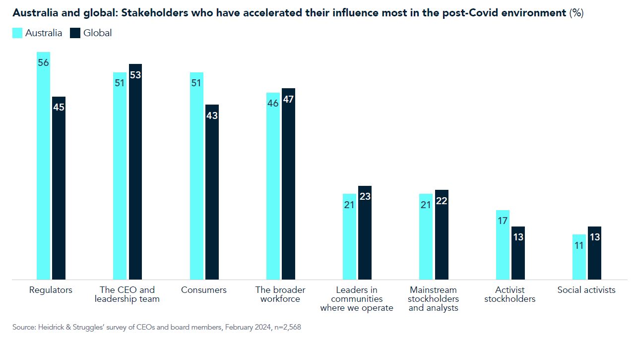 To better understand the relative influence of stakeholders today, we asked directors and CEOs to stipulate which stakeholders have accelerated their influence most in the post-Covid environment. Globally, they report that the CEO and leadership team, the broader workforce, regulators, and consumers have increased their influence more than others. In Australia, regulators top the list, with the CEO and leadership team and consumers tied in second. Although the broader workforce is only fourth in terms of increased influence on the board, engaging effectively with the workforce is foundational to organizational success and was a priority for boards before Covid.