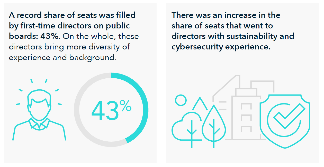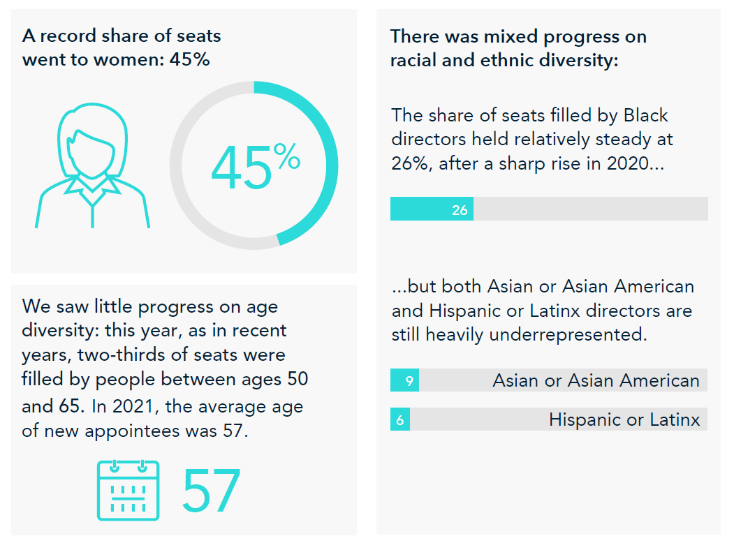 Boards have continued a trend that began in the second half of 2020: bringing in an infusion of fresh thinking by reaching out to groups of people from increasingly more diverse backgrounds. The changes of 2021 were mostly incremental but generally positive.