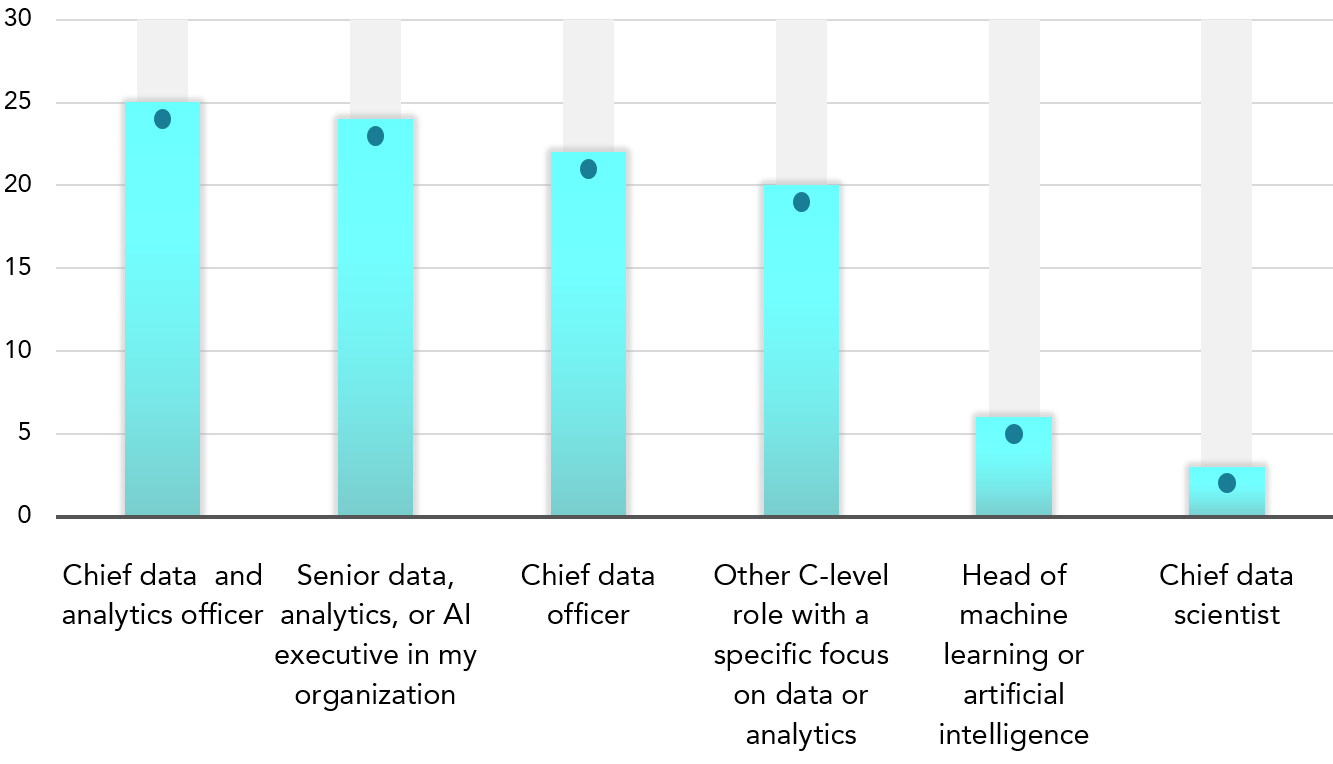 Data, analytics, and artificial intelligence responsibilities are led by people in roles that include chief data and analytics officer, chief data scientist, and head of machine learning or artificial intelligence.