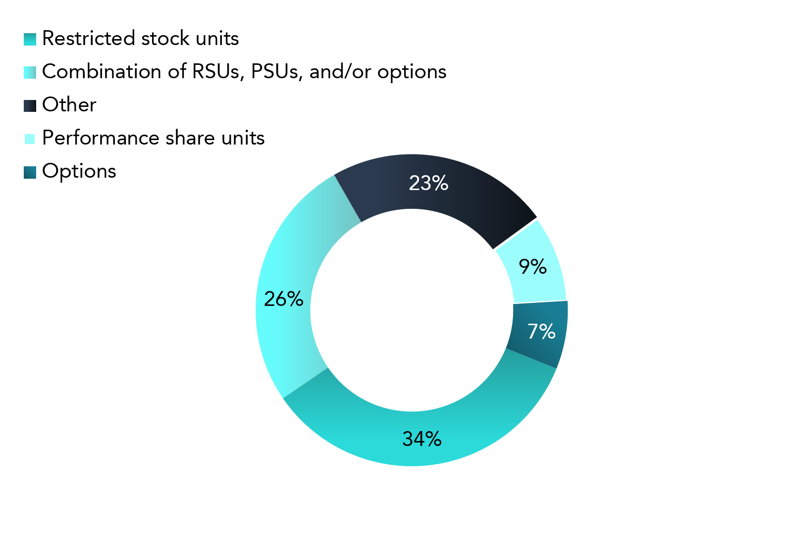 In terms of equity, 34% of executives received annual equity in the form of restricted stock units (RSUs)—30% did so in Europe and 38% did in the United States.