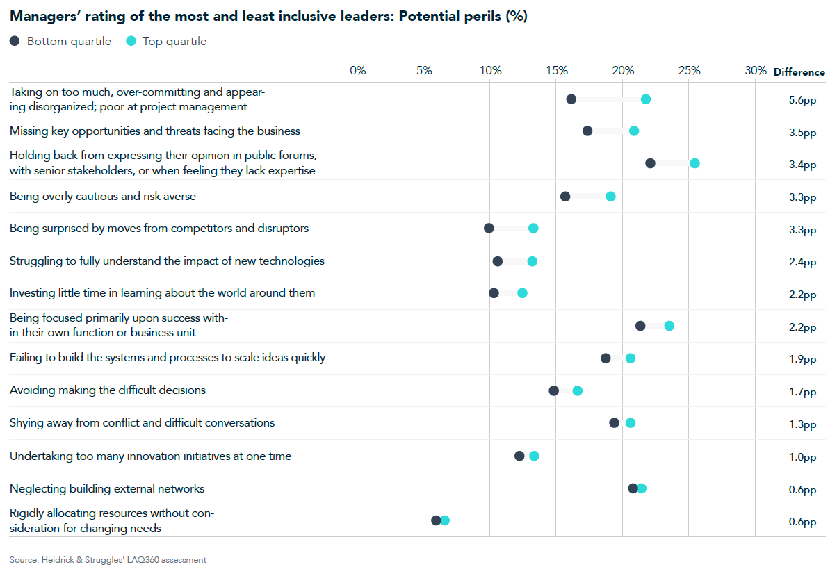 It’s notable that the differences between the most inclusive leaders and the least are smallest on behaviors related to transformation, and that the most inclusive leaders are more often rated by their managers as appearing disorganized, missing key opportunities, and holding back from expressing their opinions.