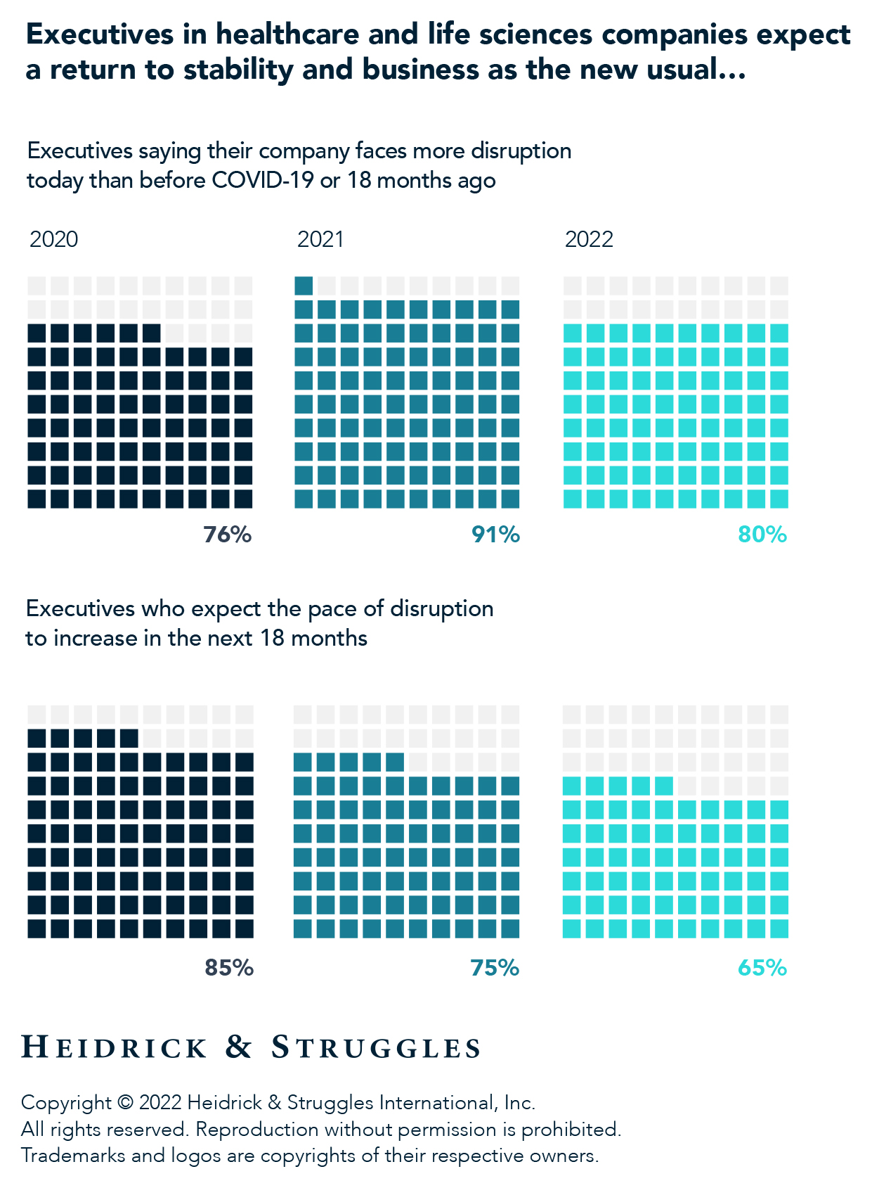 So how do executives in the industry feel they have handled the events of the past couple of years? The majority of respondents—80%—see more disruption today than before the pandemic, and two-thirds expect more disruption over the next 18 months. Nonetheless, those figures are down from the peak we saw in our prior survey.