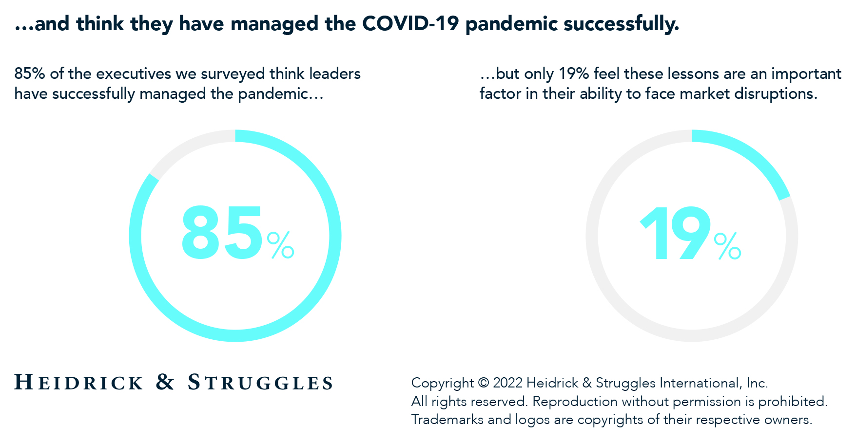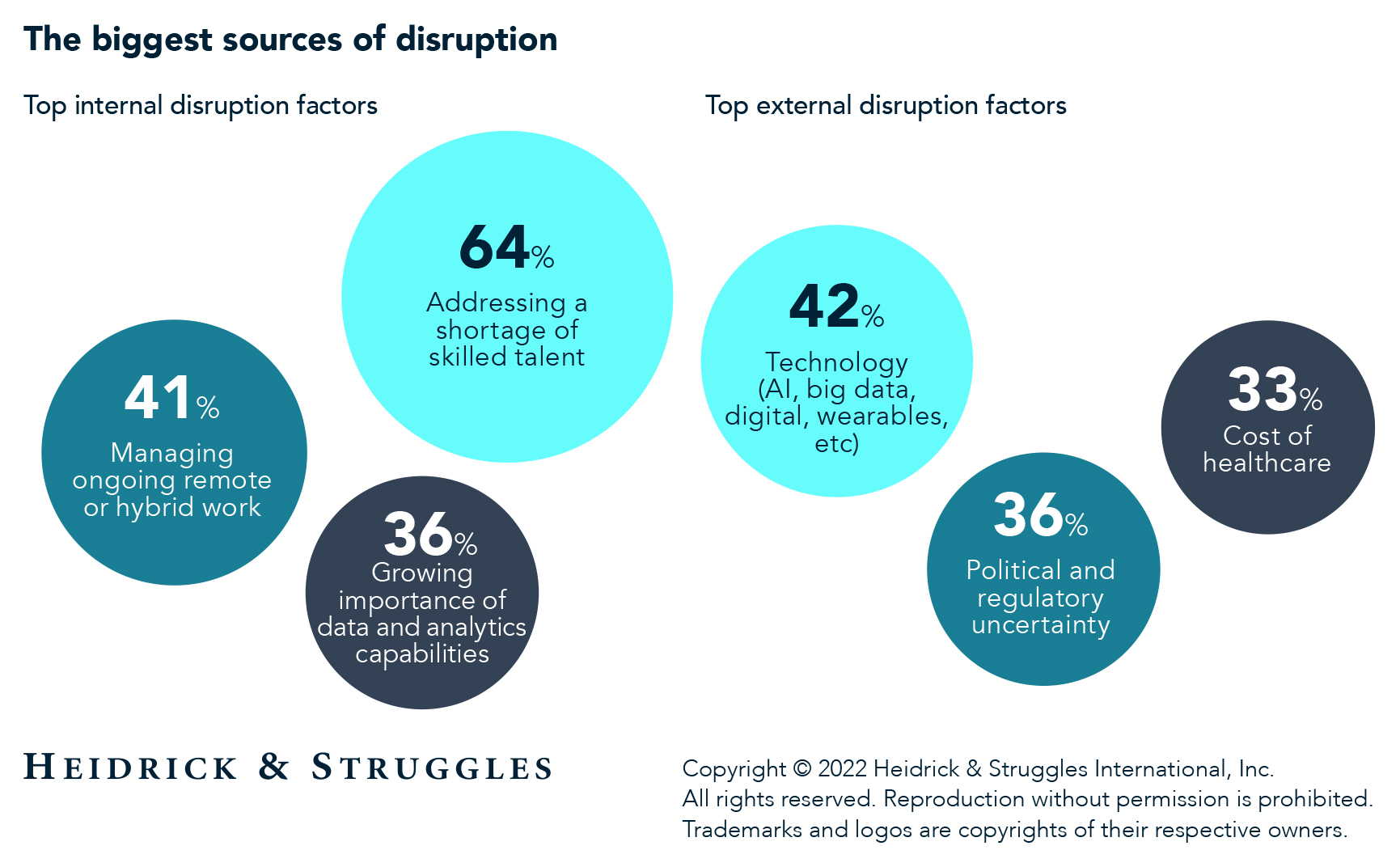 Heidrick & Struggles recently conducted an online survey of 159 senior-level executives in the healthcare and life sciences sector in order to understand how organizations are preparing for and responding to market disruption. Regionally, 66% of respondents were from the United States and Canada, 26% from Europe, and 4% from Asia Pacific and the Middle East. Thirty-seven percent of respondents were CEOs, 7% other C-suite executives, 10% general managers or other business leaders, and a further 28% were board members; others were leaders of functions including commercial, finance, HR, and R&D. Fifty-three percent of respondents had more than 25 years of experience in the healthcare and life sciences industry. Twenty percent of respondents were at companies with more than $5 billion in annual revenue, and a further 21% at companies with annual revenue between $1 billion and $5 billion. Those surveyed come from companies in biotech (27%), healthcare services (19%), medical technology (19%), and pharma (19%), with small shares of respondents in other sectors. This survey builds on previous Heidrick & Struggles research, including our work on accelerating performance—an in-depth examination of how the world’s largest companies build and sustain performance at the leader, team, and organization levels.