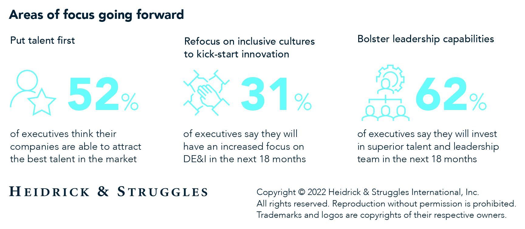 Looking ahead, the survey indicates that many executives are now retuning their companies for growth. They will be restructuring their organizations, reevaluating strategic goals, and shifting their organizational culture. Success will depend in large part on attracting and retaining the best talent. However, the fact that only 52% of executives say their companies currently do attract and retain the best talent means that many need to take steps in three areas: rethinking their talent strategy, creating inclusive cultures, and bolstering their leadership capabilities.