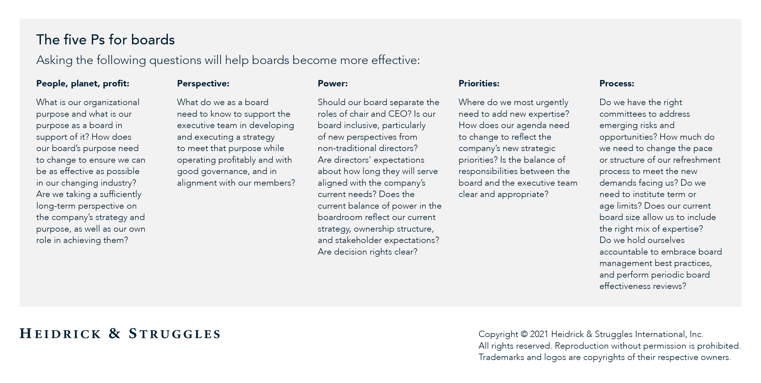 For example, one insurer we worked with recently hired its first non-family member as CEO. This new leader was just as committed as the other board members to preserving the organization’s purpose of protecting people. But he also provided a valuable outsider’s perspective that gave him a fresh view of the organization’s strengths and challenges with respect to its culture, strategy, and operations, which enabled him to see more clearly the new capabilities required at the company and on the board.