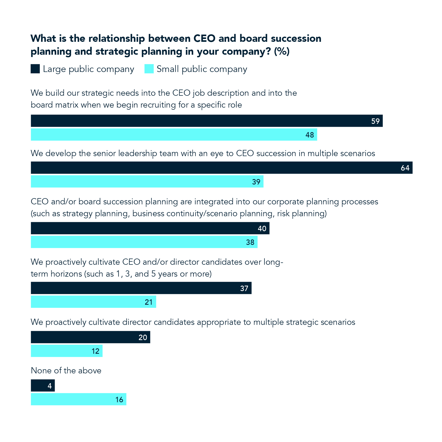 Globally, only 28% of respondents said that CEO succession is among their top priorities and is treated as such. Given that CEO succession is one of two foundational responsibilities of boards, along with oversight of strategy and performance, this figure is notably low. At public companies, the news is a little better, but the share of respondents saying they are giving CEO succession top priority is still below half.