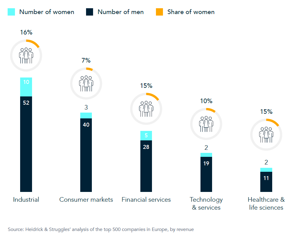 Representation varies greatly by sector and country: Industrial companies have the largest share of women in the chief supply chain officer role, at 16%, while consumer companies have the lowest, at 7%.