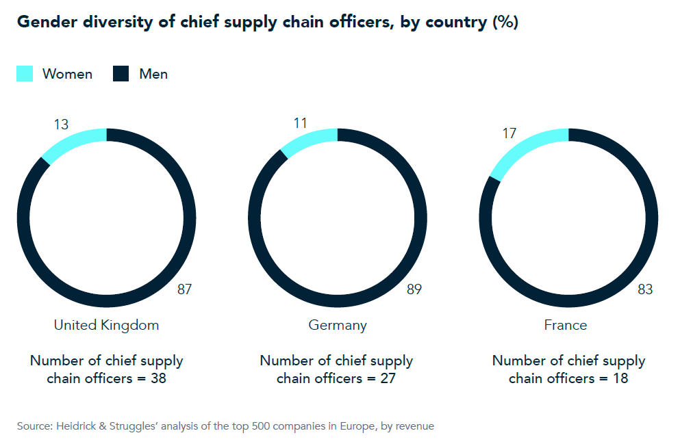 France has the highest share of women leading the supply chain function among Europe’s three largest markets, likely an outcome of its recent regulatory push for gender parity.2